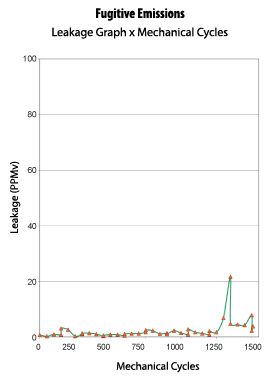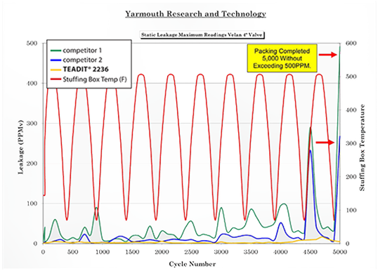 Packing 2236 reached the best results in fugitive emissions control averaging 2 PPMv without any adjustment of the gland. It outperformed all competitor products in the test performed in the Yarmouth Research and Technology, in Maine/USA, as shown in the graphs below.
